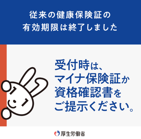 いつも当院をご利用いただきありがとうございます。 国の施策により、従来の健康保険証の有効期限は終了いたしました 。受診の際は、以下のいずれかを必ずご提示ください。
